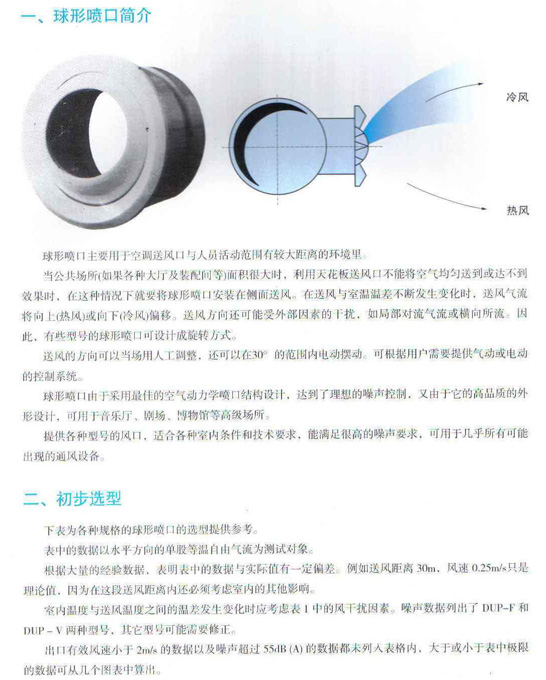 鼓型喷口具有双向调整送风角度的特点,用作空调系统和通风系统的送风口。 风口具有矩形外框结构,在外框内套装鼓壳,鼓壳内装有联动的流线形活动叶片。鼓壳可沿水平轴在俯仰方向进行±30°角范围的调整。联动叶片可在水平方向进行±45°角范围的调整。以改变送风的方向。调整方便。在风口后部可配装风量调节阀(OBD)以调整进风量。