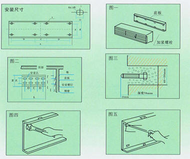 在本机的底板上已经为用户选定了******的安装孔,松开夹紧螺钉,把底板从箱体中分离出来,在底板上已设有安装孔(见图),安装必须位置准确和牢固,下面介绍其安装方法: 1安装在混凝土墙上 (1)按照不同的规格给出的安装尺寸,选好位置(图一); (2)在选定的位置上打出直径40一50mm深70mm的孔,并按(图三)的安装方法,将紧固螺栓固定在混凝土的墙壁上,同时应保证螺栓的伸出长度为1 5mm; (3)待混凝土安装凝固后,用垫圈、螺母,将底板紧固起来(图四),便可以将整机装上。 2、安装在木墙上 用木牙螺钉将底板紧固在选好的位置上(图五)再装上整机。 |
